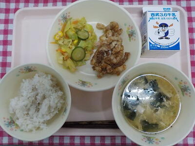 本日の給食 1月27日(火)6年生が考えた”東野小のみんなが食べて元気になるパワーアップメニュー” 2組「栄養・いろどり・デリシャス!」 投稿: 編集長 (02/02) 牛乳 麦ご飯 豚肉のゆず香り揚げ コーンサラダ かきたま汁